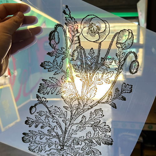 Films are another important part of the screen printing process. These are the images or designs that are used to create the stencil on the screen using that emulsion. They are normally printed on a roll of transparency film, hence the term films. The printed area on the film blocks the light from reaching the emulsion in specific places to create the stencil.