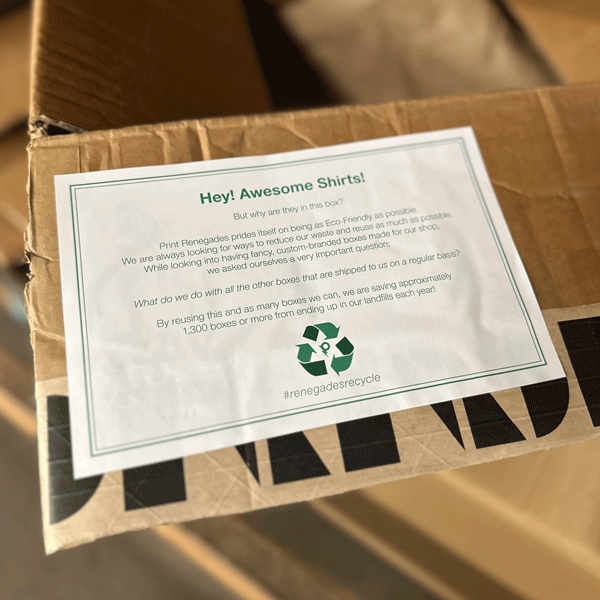 We aim to reuse every box that comes into our shop for packaging and shipping customer’s orders. While we would love to have custom-printed boxes emblazoned with our Print Renegades logo, we would be throwing away as many as 30 boxes per week (that’s over 1500 boxes a year!!). We believe that reusing the boxes that are used to ship us blank shirts is a great way to reduce our carbon footprint as well as resolve our packaging needs.