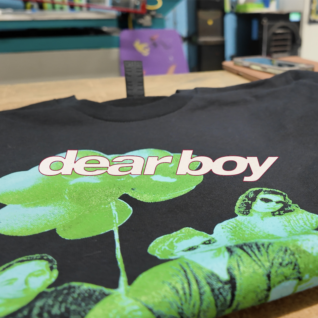 By focusing on precise screen prep and color matching across two distinct runs, we ensured that every shirt maintained the intended vintage, crackle-like texture, giving the Dear Boy merchandise that genuine, pre-worn character their fans love. The result is high-quality band merch that looks like a well-loved vintage find, ready to rock the LA show!